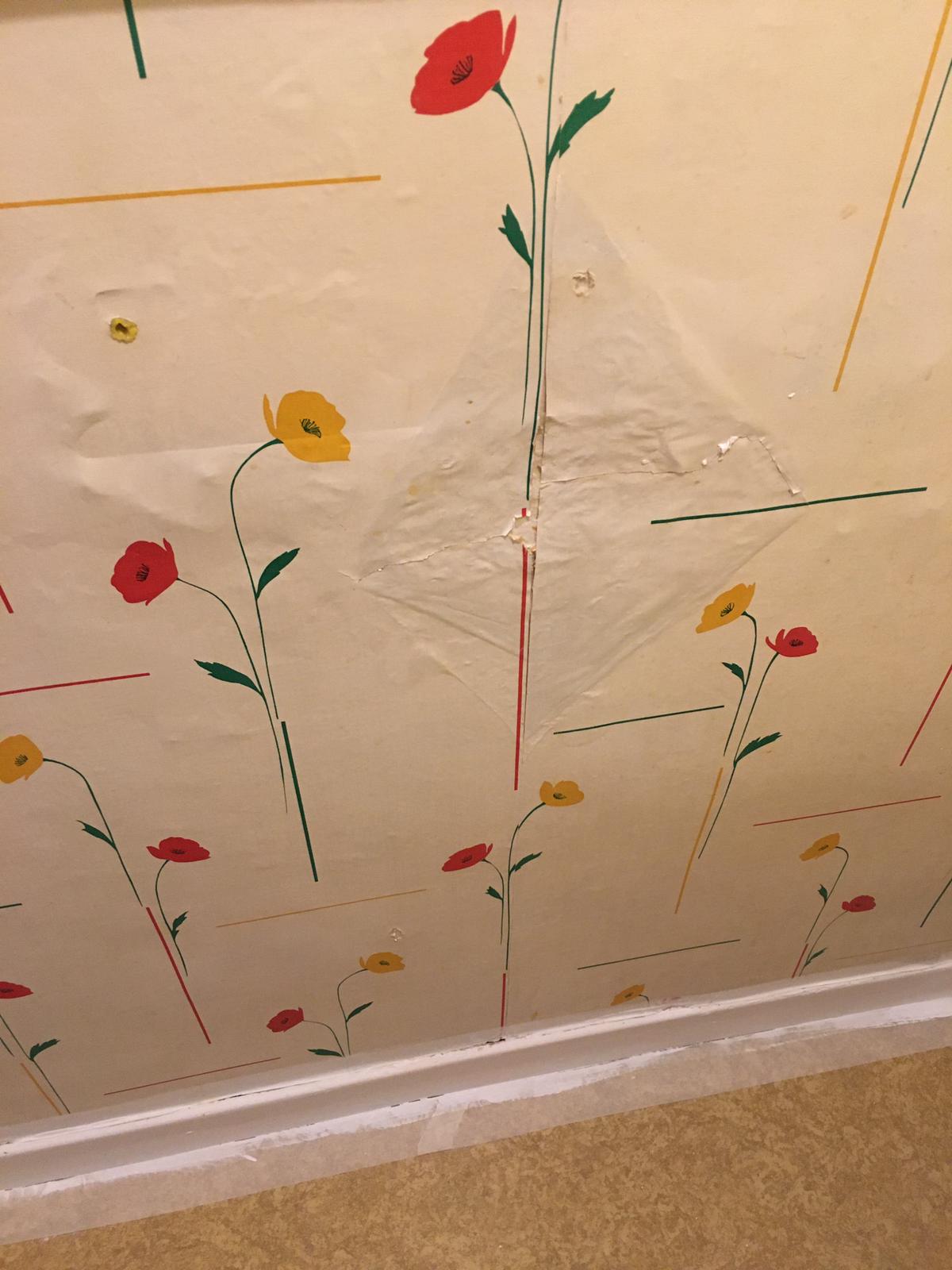 J'ai ouvert au cutter la tapisserie pour accéder aux endroits abimés. J'ai gratté ce qui s'effritait, avant d'appliquer un enduit de lissage. J'ai ensuite recoller la tapisserie.