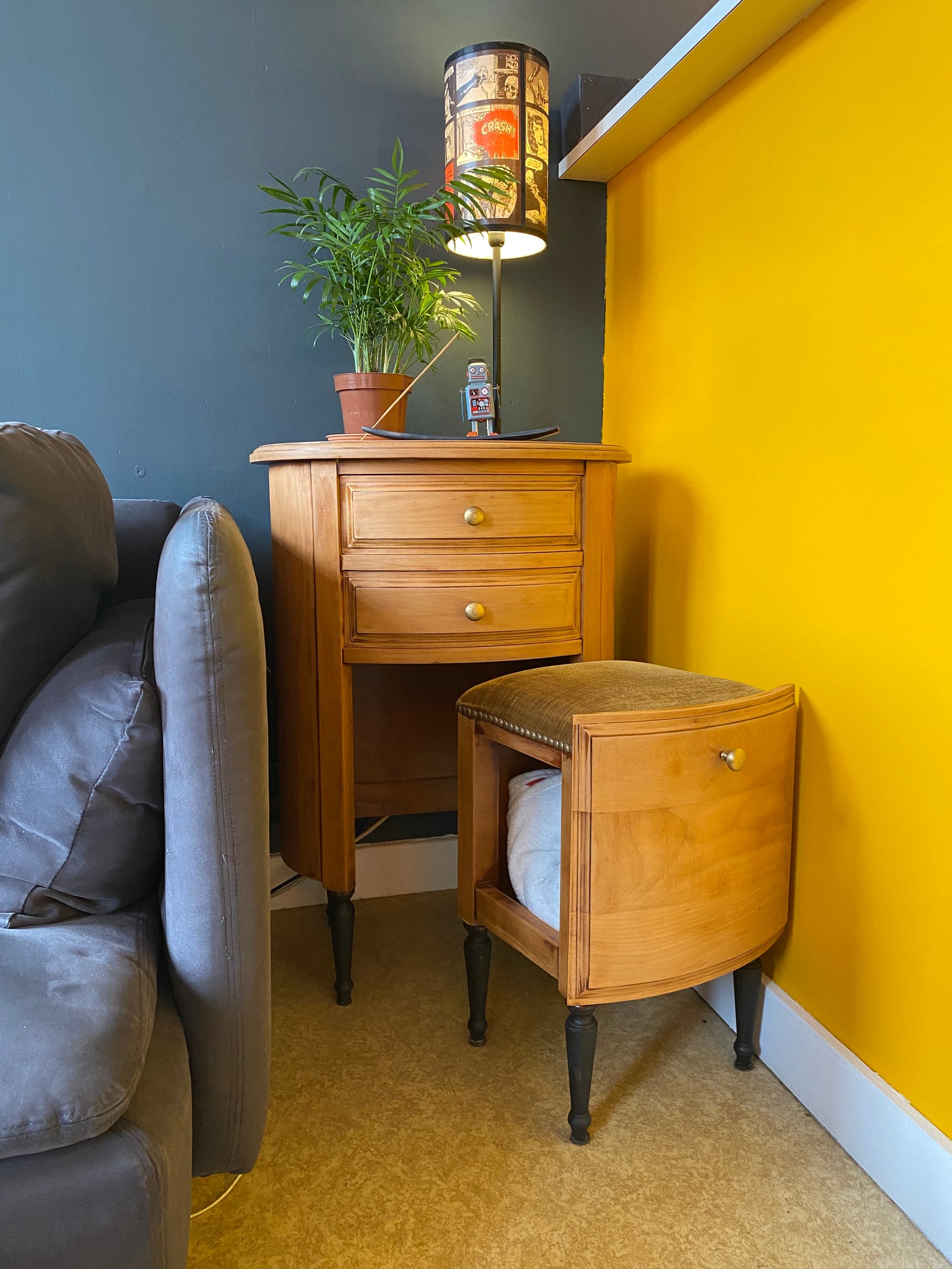 Afin de remplacer l'ancien bout de canapé, j'ai chiné un vieux meuble à téléphone. Anciennement laqué d'une couleur merisier, bien orangé comme aimaient nos mamies, j'ai choisi de poncer l'intégralité pour ensuite appliquer le même vernis que pour les autres bois. Les pieds eux ont eu le droit à un vrai ravalement de façade puisque je les ai peint en noir mate en rappel à la table de salon et les lampes fraichement rénovées.